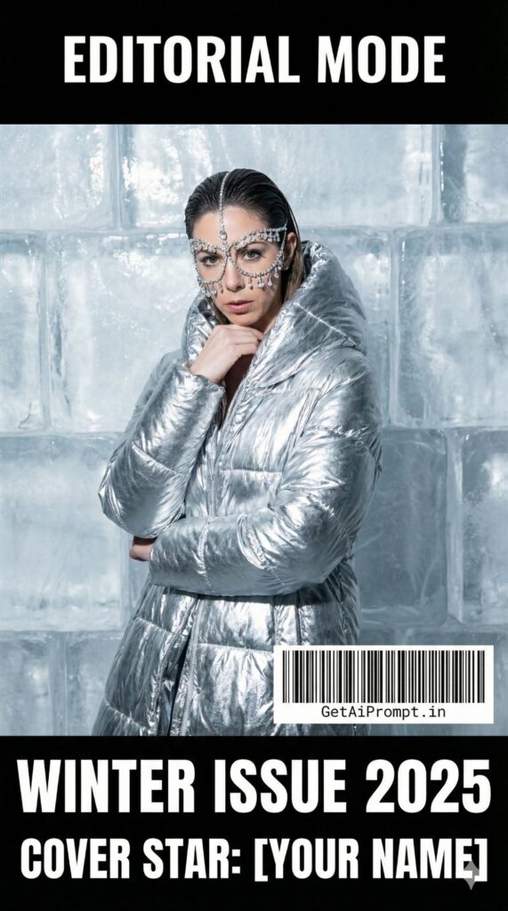 A fierce, high-contrast fashion editorial shot based on the uploaded image. The subject with [100% identical and same face in uploaded images] is posing against a wall of solid ice blocks. The lighting is harsh, high-flash studio lighting. They are wearing [OUTFIT: a silver metallic puffer gown, crystal face jewelry, slicked-back hair]. The aesthetic is "Ice Queen" luxury. **TEMPLATE OVERLAY:** Bold, sans-serif magazine-style typography overlaid on the bottom reads: "WINTER ISSUE 2025" and "COVER STAR: [YOUR NAME]". Embedded Branding: The text "GetAiPrompt.in" is the barcode on the magazine cover. Top Bar: A horizontal black bar at the very top edge containing the text "EDITORIAL MODE" in bold white cinematic font. --ar 9:16