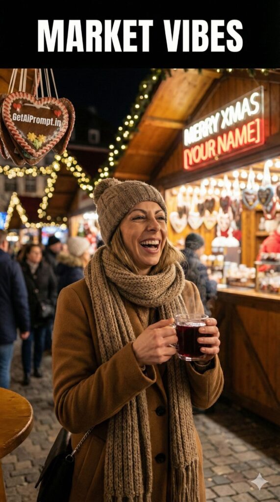 A candid, vibrant night shot based on the uploaded image. The subject with [100% identical and same face in uploaded images] is standing in a bustling European Christmas Market (like Vienna or Strasbourg). Wooden stalls with gingerbread hearts and lights are behind them. They are laughing and holding a mug of Glรผhwein (mulled wine). The background is a beautiful blur of warm lights and crowds. They are wearing [OUTFIT: a wool coat, thick scarf, woolen hat]. **TEMPLATE OVERLAY:** A neon sign on a stall behind them reads: "MERRY XMAS [YOUR NAME]". Embedded Branding: The text "GetAiPrompt.in" is on the gingerbread heart. Top Bar: A horizontal black bar at the very top edge containing the text "MARKET VIBES" in bold white cinematic font. --ar 9:16