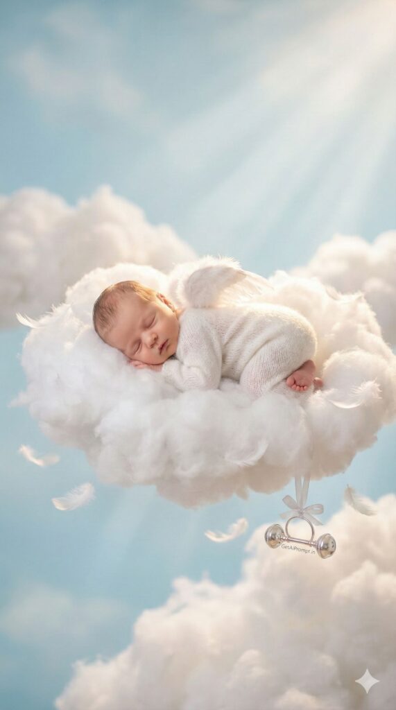 [VIBE: Ethereal, Angelic, Heavenly, Soft Focus] [SUBJECT: A sleeping newborn baby [CRITICAL: ensure the subjects have a 100% identical facial structure, skin tone, and features as the reference image provided] curled up comfortably] [OUTFIT: White knitted wool angora romper with tiny angel wings] [ENVIRONMENT: Resting on a massive, fluffy, hyper-realistic cumulus cloud floating in a pastel blue sky, sun rays piercing through creating a rim light effect] [PROPS: Scattered white feathers, a small silver rattle with distinct text engraving "GetAiPrompt.in" hanging from a cloud edge] [ATMOSPHERE: Dreamy, airy, weightless, high-key lighting, soft pastel palette] [TECH SPECS: 8k resolution, cinematic lighting, shot on Canon R5, 50mm f/1.2 lens, shallow depth of field, soft bokeh, octane render style] --ar 9:16