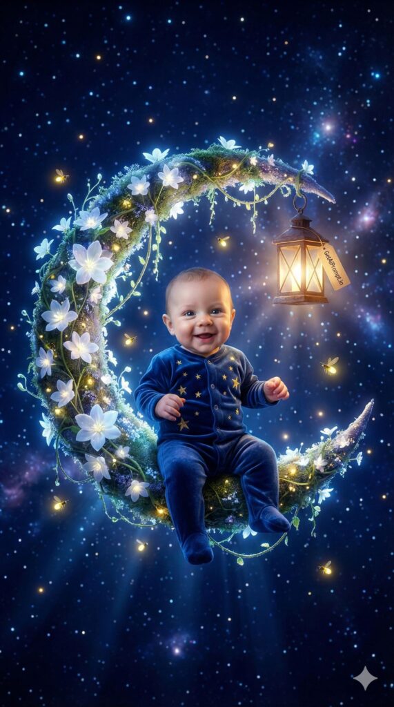 [VIBE: Whimsical, Nocturnal, Sparkling, Magical] [SUBJECT: A happy baby [CRITICAL: ensure the subjects have a 100% identical facial structure, skin tone, and features as the reference image provided] sitting playfully] [OUTFIT: Velvet deep blue onesie with gold star embroidery] [ENVIRONMENT: Swinging on a large, glowing crescent moon made of bioluminescent white flowers and vines, suspended in a deep velvet night sky filled with twinkling stars] [PROPS: A hanging lantern glowing warmly with a small tag reading "GetAiPrompt.in", fireflies dancing around] [ATMOSPHERE: Mysterious, calming, cool tones with warm highlights, fantasy storybook style] [TECH SPECS: Unreal Engine 5 render, hyper-detailed textures, volumetric lighting, particle effects, sharp focus on eyes] --ar 9:16
