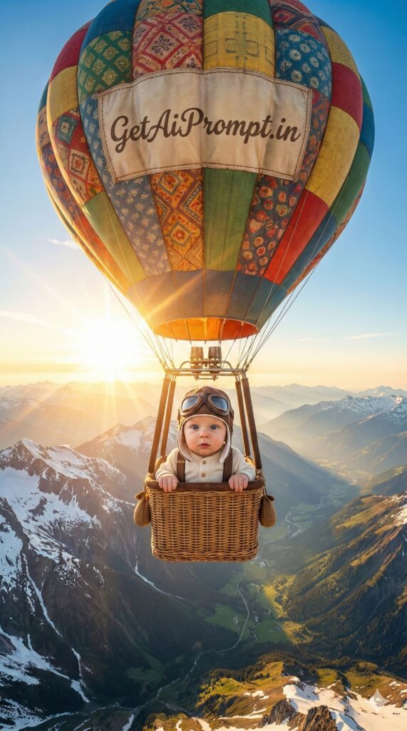 [VIBE: Adventurous, Vibrant, Cheerful, Expansive] [SUBJECT: A curious baby [CRITICAL: ensure the subjects have a 100% identical facial structure, skin tone, and features as the reference image provided] peering over the edge] [OUTFIT: Vintage aviator hat and leather goggles, brown suspenders] [ENVIRONMENT: Sitting inside a tiny, woven wicker basket attached to a giant, colorful vintage hot air balloon floating above majestic snow-capped mountains and a sunrise valley] [BRANDING: The fabric of the balloon features a stylish vintage patch logo that says "GetAiPrompt.in"] [ATMOSPHERE: Golden hour lighting, lens flare, sense of height and scale, majestic freedom] [TECH SPECS: Wide angle shot, GoPro Hero 12 style clarity, high dynamic range (HDR), vivid colors, 8k realism] --ar 9:16