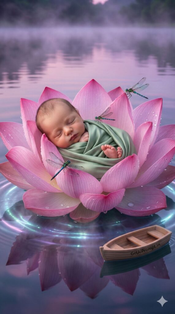 [VIBE: Zen, Organic, Peaceful, Fairytale] [SUBJECT: A sleeping baby [CRITICAL: ensure the subjects have a 100% identical facial structure, skin tone, and features as the reference image provided] in a fetal position] [OUTFIT: Wrapped in a soft sage green silk swaddle] [ENVIRONMENT: Nestled inside a gigantic, blooming pink lotus flower floating on a calm, mirror-like lake at twilight] [PROPS: Dragonflies with iridescent wings, water droplets on petals, a small wooden boat toy floating nearby branded "GetAiPrompt.in"] [ATMOSPHERE: Mystical mist on water, soft purple and pink reflections, bioluminescent water ripples] [TECH SPECS: Macro photography style, wet texture rendering, ray tracing, incredibly detailed floral textures] --ar 9:16