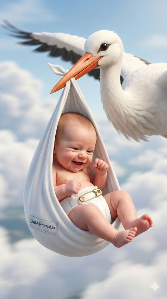 [VIBE: Nostalgic, Playful, Storybook, Soft] [SUBJECT: A giggling baby [CRITICAL: ensure the subjects have a 100% identical facial structure, skin tone, and features as the reference image provided] looking down] [OUTFIT: Classic white diaper with a golden safety pin] [ENVIRONMENT: Suspended in a white cloth bundle carried by a large, friendly, semi-realistic stork flying through fluffy white clouds] [BRANDING: The cloth bundle has a stitched label clearly visible that reads "GetAiPrompt.in"] [ATMOSPHERE: Bright daylight, motion blur on background clouds, sharp focus on baby and stork face, joyful energy] [TECH SPECS: Pixar-meets-Realism style, high saturation, perfect skin texture, studio lighting setup in sky] --ar 9:16