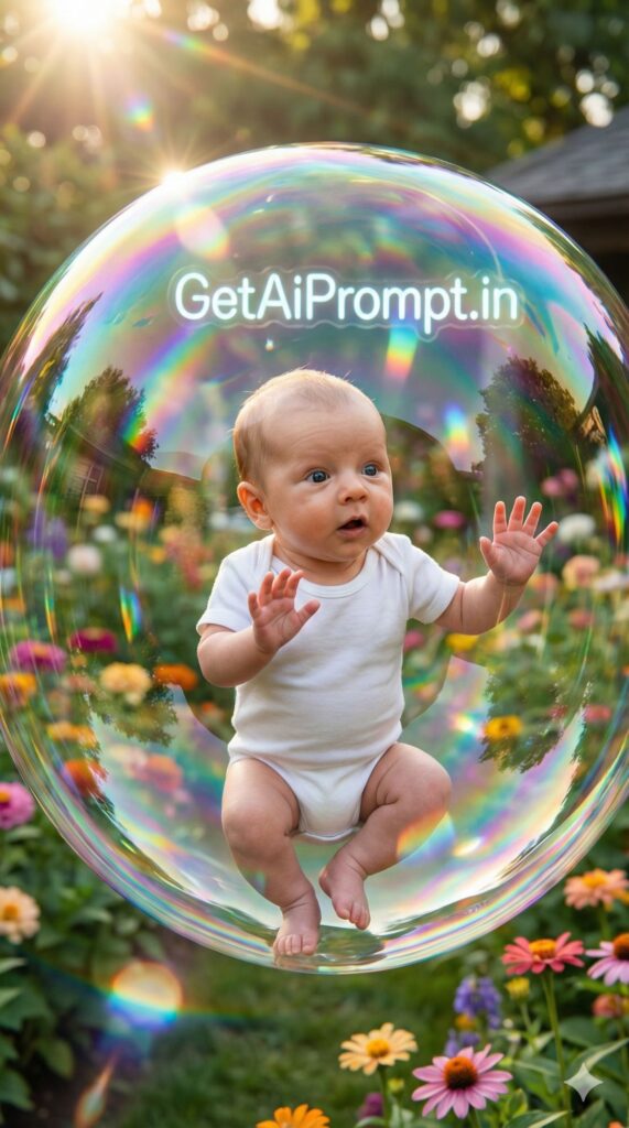[VIBE: Fragile, Prismatic, Clean, Modern Art] [SUBJECT: An amazed baby [CRITICAL: ensure the subjects have a 100% identical facial structure, skin tone, and features as the reference image provided] touching the walls] [OUTFIT: Minimalist white cotton bodysuit] [ENVIRONMENT: Sitting inside a giant, indestructible soap bubble floating in a sunlit garden full of flowers] [BRANDING: The bubble reflection subtly distorts a neon sign in the background spelling "GetAiPrompt.in"] [ATMOSPHERE: Rainbow light refraction on the bubble surface, lens flares, airy and light, purity] [TECH SPECS: Ray-traced reflections, chromatic aberration, sharp focus, glassy texture rendering] --ar 9:16