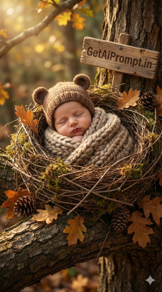 [VIBE: Rustic, Warm, Autumnal, Cozy] [SUBJECT: A sleeping baby [CRITICAL: ensure the subjects have a 100% identical facial structure, skin tone, and features as the reference image provided] snug and warm] [OUTFIT: Brown bear ear hat and chunky knit blanket] [ENVIRONMENT: Sleeping in a large, intricate bird's nest made of twigs and moss, perched safely on a thick oak tree branch] [PROPS: Autumn leaves, pinecones, a small wooden carved sign nailed to the branch saying "GetAiPrompt.in"] [ATMOSPHERE: Dappled sunlight filtering through leaves (komorebi), warm golden tones, nature sounds visualization] [TECH SPECS: National Geographic style, high texture detail on wood and wool, natural lighting] --ar 9:16