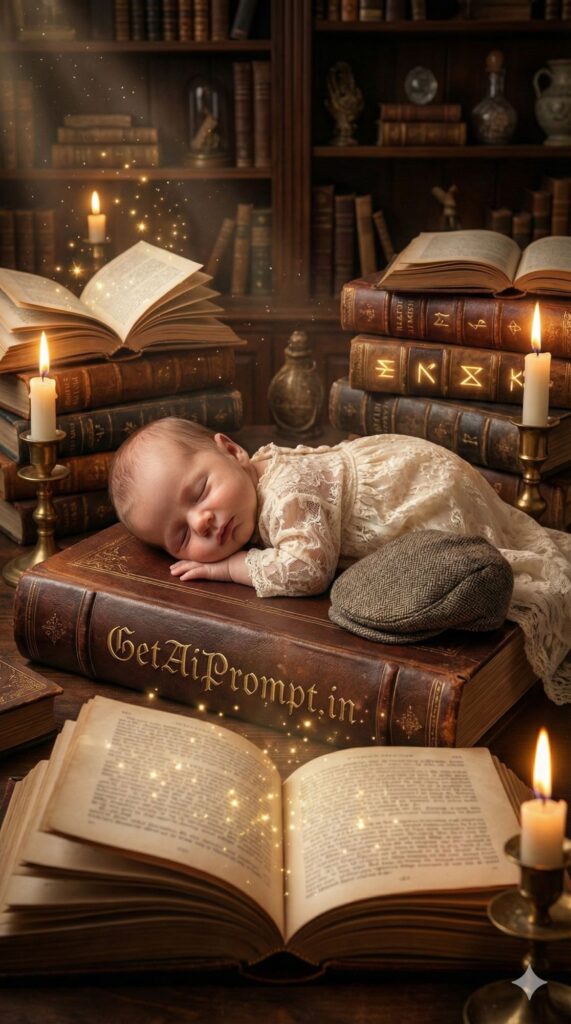 [VIBE: Intellectual, Vintage, Historical, Magical] [SUBJECT: A tiny baby [CRITICAL: ensure the subjects have a 100% identical facial structure, skin tone, and features as the reference image provided] sleeping on stomach] [OUTFIT: Vintage lace gown or tweed flat cap and suspenders] [ENVIRONMENT: Sleeping on top of a giant, open, ancient leather-bound storybook, surrounded by stacks of other magical books and candlelight] [BRANDING: The title of the open book is embossed in gold leaf script: "GetAiPrompt.in"] [ATMOSPHERE: Dust motes dancing in candlelight, warm library ambiance, magical sparkles rising from the pages] [TECH SPECS: Dark academia aesthetic, warm color temperature, rich leather textures, detailed paper grain] --ar 9:16