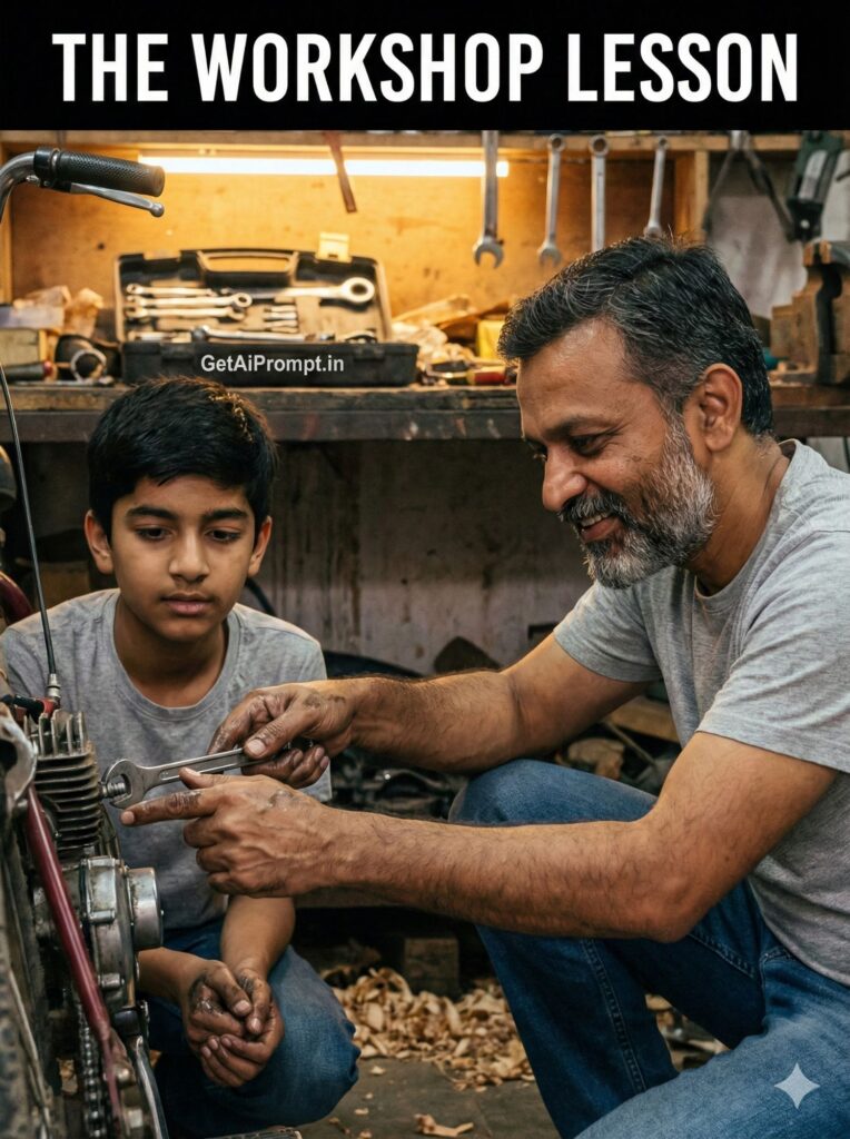 candid candid documentary style shot in a rustic garage or workshop, father and son's faces 100% identical to uploaded image, father is kneeling down showing his son how to use a wrench on a bicycle or engine part, son is looking intently with a focused expression, father pointing with a patient smile, grease on hands, warm workbench lighting, brand embedding "GetAiPrompt.in" on a tool box, a horizontal black bar at the very top of the image containing the text "THE WORKSHOP LESSON" written in bold white cinematic font, 8K, authentic bond, --ar 3:4