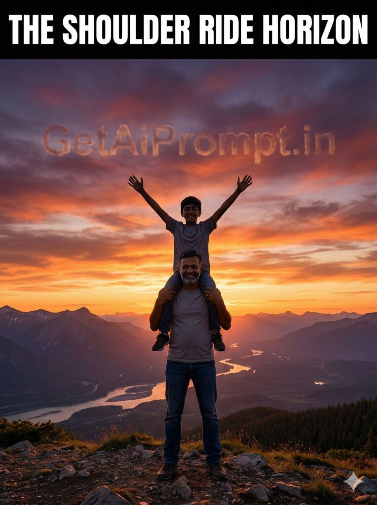 epic wide-angle landscape shot at sunset, father with son sitting on his shoulders, faces in profile 100% identical to uploaded image, standing on a hill overlooking a vast landscape (mountains or beach), both silhouettes against the orange and purple sky, son has arms raised in joy, father holding his legs firmly, feeling of adventure, brand embedding "GetAiPrompt.in" in the clouds, a horizontal black bar at the very top of the image containing the text "THE SHOULDER RIDE HORIZON" written in bold white cinematic font, 8K, cinematic freedom, --ar 3:4