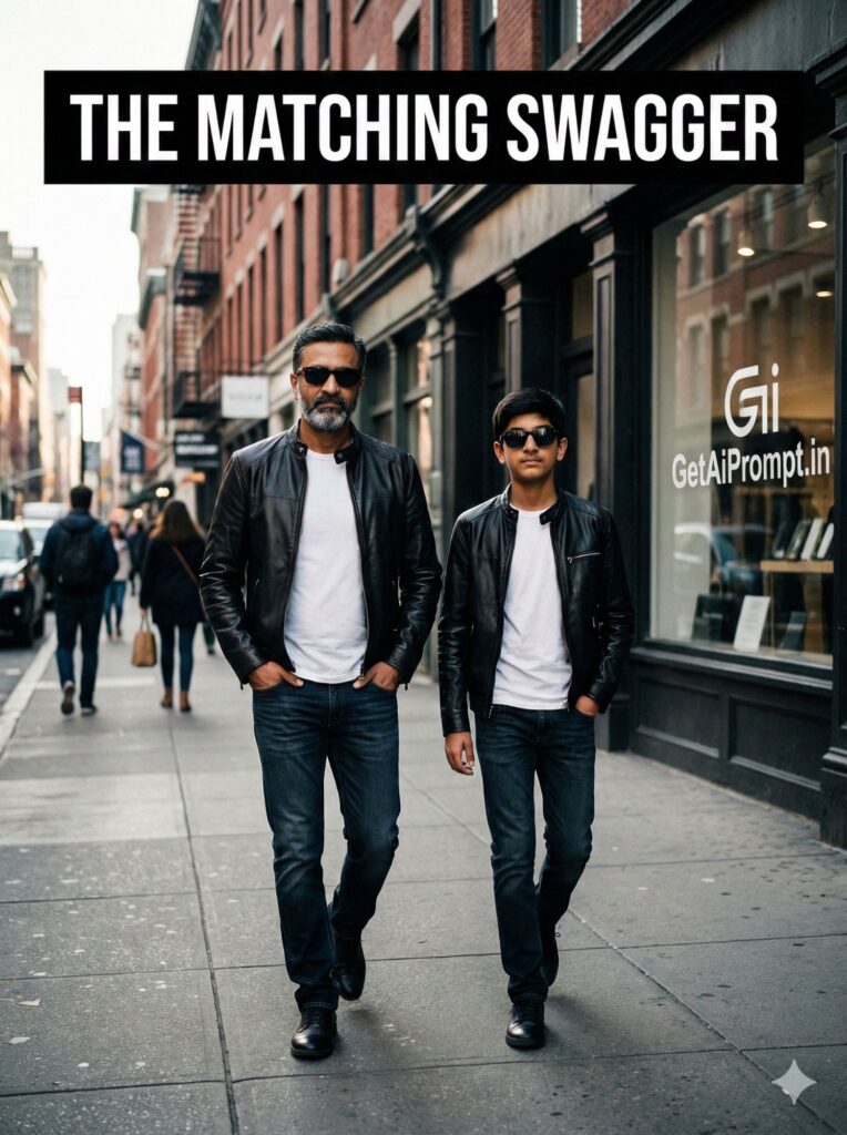 stylish street photography shot, father and son walking side-by-side on a city sidewalk, faces 100% identical to uploaded image, wearing identical [OUTFIT_STYLE: Leather Jackets, White Tees, and Sunglasses], matching confident stride, looking forward with cool expressions, hands in pockets, blurred city background, brand embedding "GetAiPrompt.in" on a shop window, a horizontal black bar at the very top of the image containing the text "THE MATCHING SWAGGER" written in bold white cinematic font, 8K, cool dad vibe, --ar 3:4