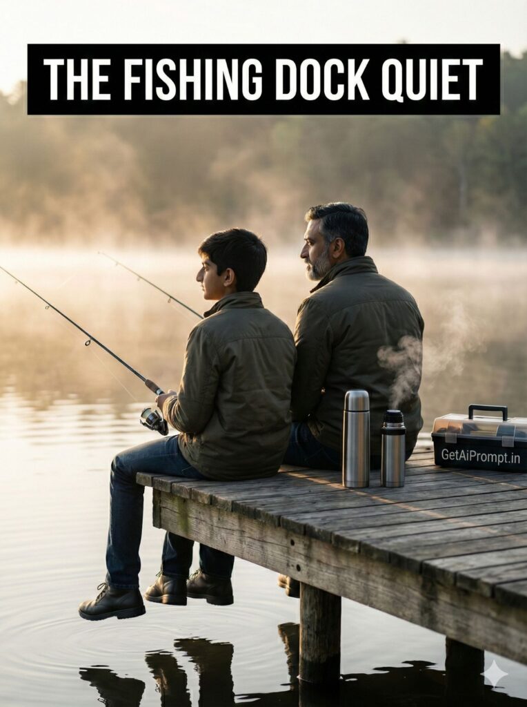 peaceful lifestyle shot from behind on a wooden fishing dock at dawn, father and son sitting with legs dangling over water, holding fishing rods, faces in profile 100% identical to uploaded image, mist rising from the lake, thermoses next to them, quiet bonding moment, natural light, brand embedding "GetAiPrompt.in" on a tackle box, a horizontal black bar at the very top of the image containing the text "THE FISHING DOCK QUIET" written in bold white cinematic font, 8K, serene morning, --ar 3:4