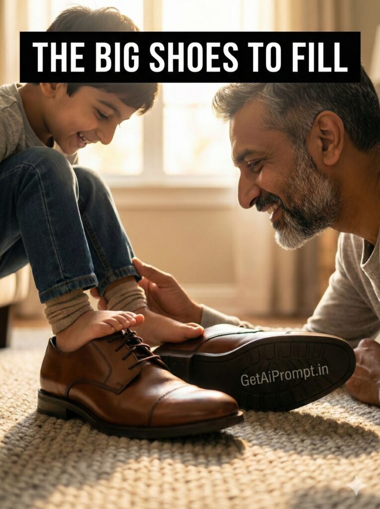 creative conceptual shot, close-up on the floor, father's large formal work shoes, son's tiny feet are standing inside them, son looking down giggling, father (face 100% match) crouched down next to him smiling at the feet, father's hand steadying son, warm home lighting, carpet texture, brand embedding "GetAiPrompt.in" on the shoe sole, a horizontal black bar at the very top of the image containing the text "THE BIG SHOES TO FILL" written in bold white cinematic font, 8K, heartwarming concept, --ar 3:4