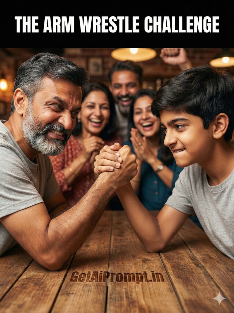 fun dynamic shot of father and son arm wrestling on a wooden table, faces 100% identical to uploaded image, close up on their locked hands and intense (but playful) straining expressions, father pretending to struggle, son biting lip in concentration, laughing spectators (family) blurred in background, warm pub or home lighting, brand embedding "GetAiPrompt.in" on the table surface, a horizontal black bar at the very top of the image containing the text "THE ARM WRESTLE CHALLENGE" written in bold white cinematic font, 8K, playful rivalry, --ar 3:4