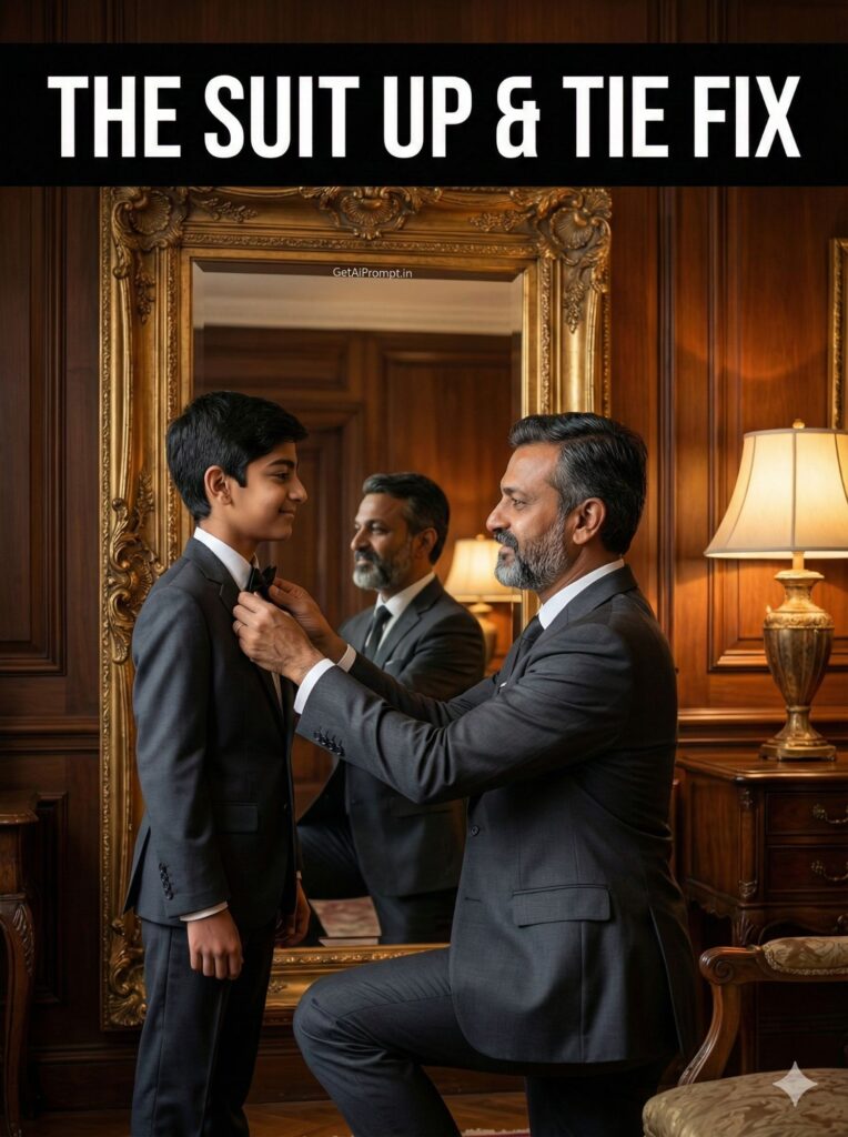 elegant formal portrait, father and son getting ready in front of a large mirror, faces 100% identical to uploaded image (seen in reflection and reality), father is kneeling to adjust the son's bowtie or tie, son looking at his father with admiration, both in sharp suits, luxurious room setting, warm lamp light, brand embedding "GetAiPrompt.in" on the mirror frame, a horizontal black bar at the very top of the image containing the text "THE SUIT UP & TIE FIX" written in bold white cinematic font, 8K, classy moment, --ar 3:4