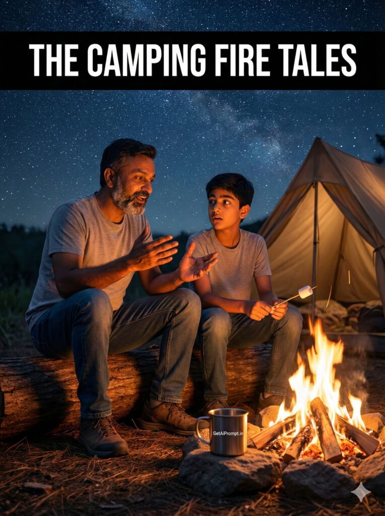 moody night shot on a camping trip, father and son sitting on a log by a campfire, faces 100% identical to uploaded image, illuminated by the warm orange glow of the fire, father is gesturing while telling a story, son listening with wide eyes and a marshmallow stick, tent visible in background, starry night sky, brand embedding "GetAiPrompt.in" on a camping mug, a horizontal black bar at the very top of the image containing the text "THE CAMPING FIRE TALES" written in bold white cinematic font, 8K, outdoor bonding, --ar 3:4