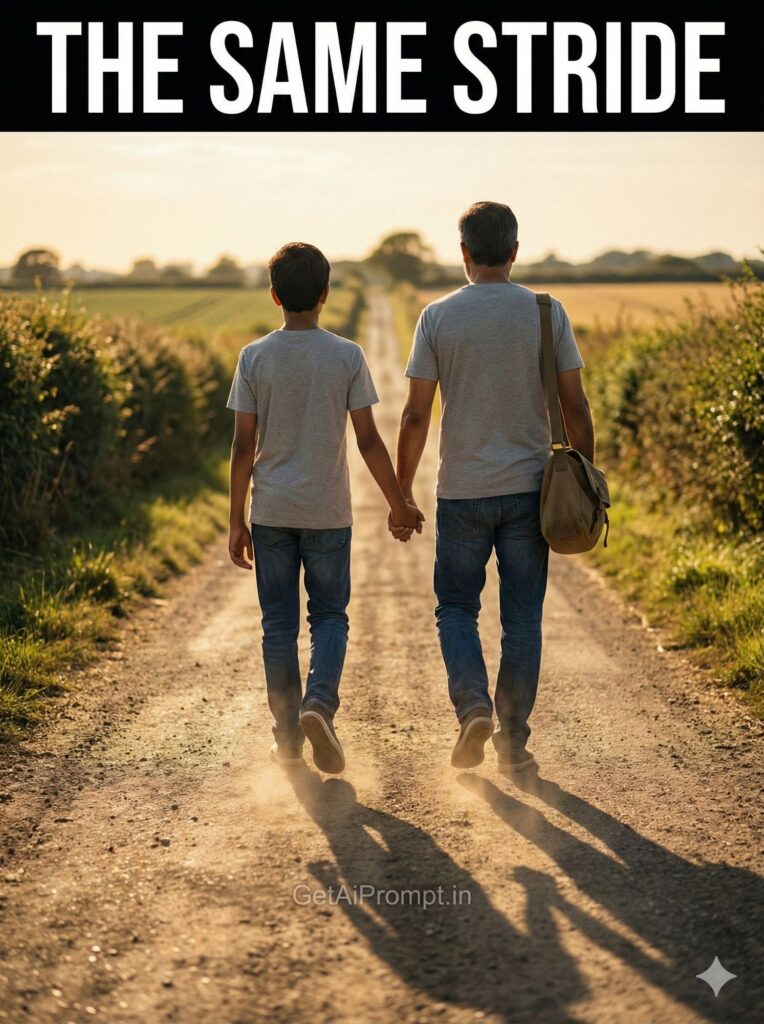 cinematic shot from behind of father and son walking away down a country lane or beach, faces not visible but body types match reference, holding hands, their walking stride is perfectly synchronized (same foot forward), father carrying a bag over shoulder, long shadows cast by late afternoon sun, feeling of journey and guidance, brand embedding "GetAiPrompt.in" in the dust trail, a horizontal black bar at the very top of the image containing the text "THE SAME STRIDE" written in bold white cinematic font, 8K, poignant moment, --ar 3:4