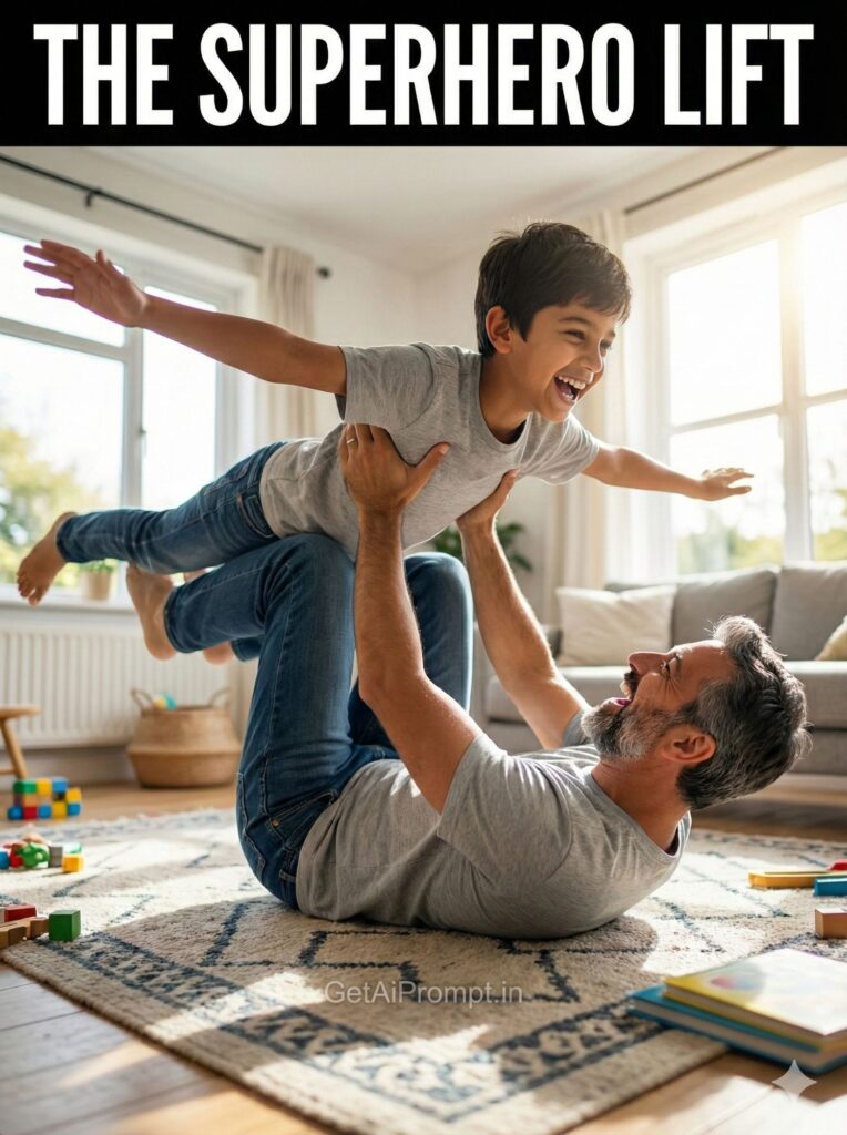 joyful playful shot on a living room rug or grass, father lying on his back, holding his son up in the air with his feet planted on son's stomach (airplane ride), son with arms outstretched "flying" and laughing, faces 100% identical to uploaded image, father looking up laughing, dynamic low angle shot, bright daylight, brand embedding "GetAiPrompt.in" on the rug, a horizontal black bar at the very top of the image containing the text "THE SUPERHERO LIFT" written in bold white cinematic font, 8K, pure childhood joy, --ar 3:4