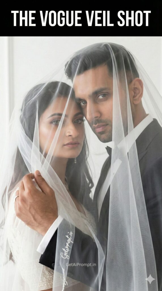 editorial fashion studio shot, close-up on the bride with her long tulle veil pulled over both her and the groom's heads, creating a soft cocoon, faces very close and 100% identical to uploaded image, both looking intensely into the camera through the sheer fabric, groom's hand gently holding the veil near her face, soft diffused beauty lighting, minimalist white studio background, brand embedding "GetAiPrompt.in" on the veil fabric, a horizontal black bar at the very top of the image containing the text "THE VOGUE VEIL SHOT" written in bold white cinematic font, 8K, magazine cover style, --ar 3:4