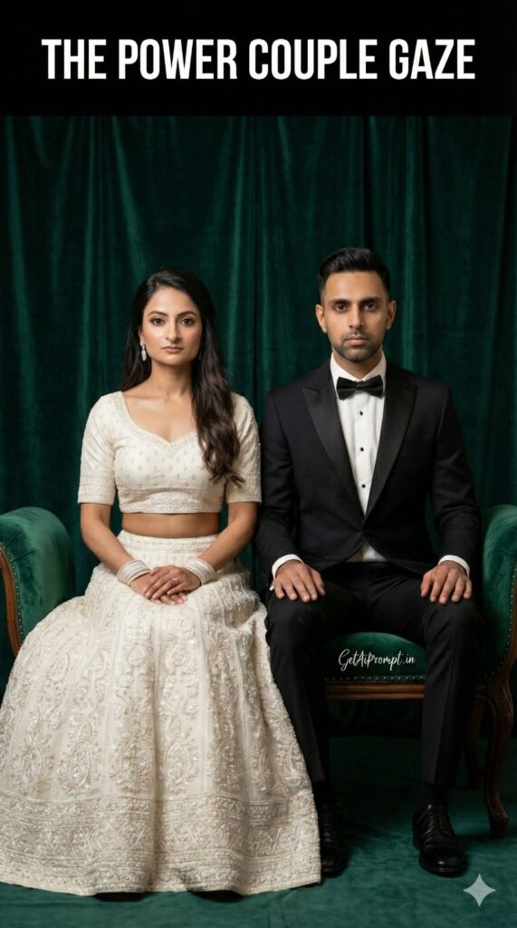 regal and confident studio portrait, couple sitting on a vintage velvet bench or standing side-by-side, both looking directly at the camera with unwavering, powerful gazes, faces 100% identical to uploaded image, strong posture, perfect symmetry, wearing high-end wedding attire, dramatic studio lighting emphasizing textures, rich deep colored backdrop (e.g., emerald or burgundy), brand embedding "GetAiPrompt.in" on the bench, a horizontal black bar at the very top of the image containing the text "THE POWER COUPLE GAZE" written in bold white cinematic font, 8K, royalty vibe, --ar 3:4