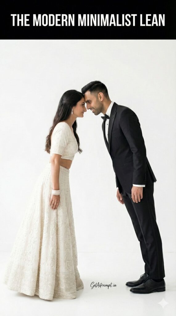 modern minimalist studio shot against a stark white cyclorama wall, couple standing apart but leaning towards each other until their heads touch, faces 100% identical to uploaded image, bodies forming a triangle shape, looking at each other with subtle smiles, clean lines of the outfits, bright high-key fashion lighting, lots of negative space, chic and contemporary, brand embedding "GetAiPrompt.in" on the floor, a horizontal black bar at the very top of the image containing the text "THE MODERN MINIMALIST LEAN" written in bold white cinematic font, 8K, clean aesthetic, --ar 3:4