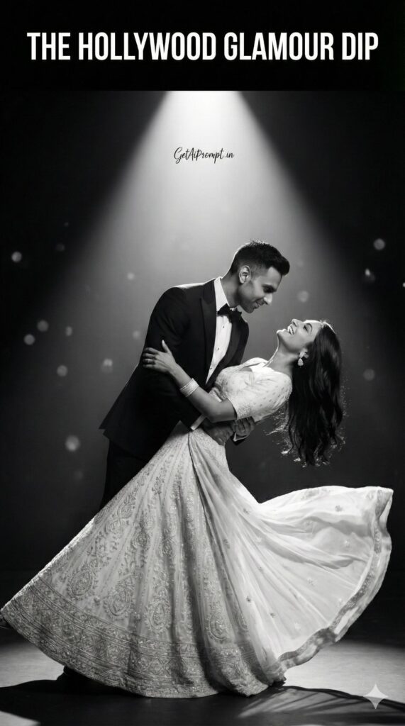 classic Hollywood glamour style studio shot, groom dipping the bride low in a dramatic dance pose, faces 100% identical to uploaded image, bride laughing with head thrown back, groom looking down at her with adoration, dramatic spotlight from above creating strong highlights and shadows, flowing dress frozen in motion, dark studio background with faint bokeh lights, brand embedding "GetAiPrompt.in" in the spotlight beam, a horizontal black bar at the very top of the image containing the text "THE HOLLYWOOD GLAMOUR DIP" written in bold white cinematic font, 8K, cinematic romance, --ar 3:4