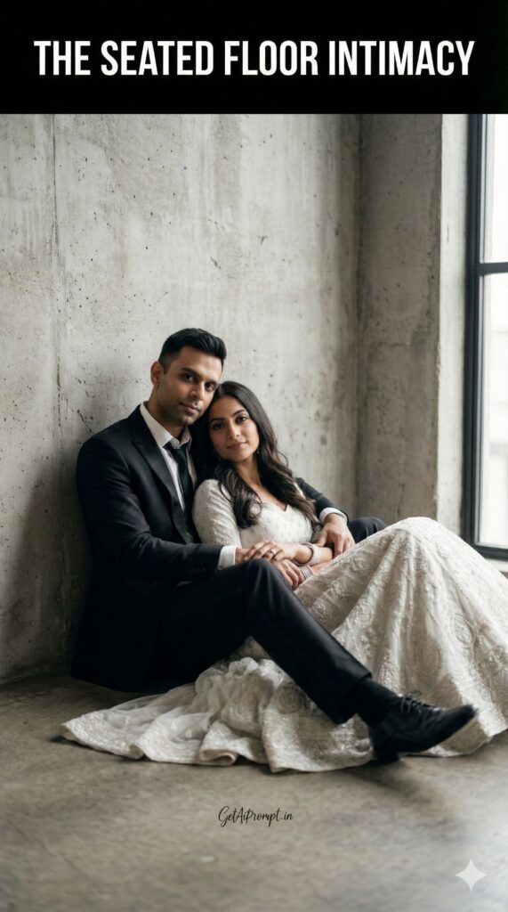 raw and grounded studio portrait, couple sitting closely together on the floor against a textured concrete wall, bride sitting between groom's legs, his arms wrapped around her, leaning heads together, faces 100% identical to uploaded image, looking at the camera with relaxed, intimate expressions, wedding outfits spread casually around them, soft natural-style light from a large window (simulated), brand embedding "GetAiPrompt.in" on the concrete, a horizontal black bar at the very top of the image containing the text "THE SEATED FLOOR INTIMACY" written in bold white cinematic font, 8K, authentic connection, --ar 3:4