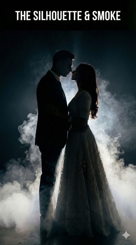 dramatic silhouette studio shot, couple standing in profile facing each other, about to kiss, outlines of their faces and bodies 100% identical to uploaded image (shape match), backlit by a strong light source creating a rim around them, theatrical smoke or fog swirling around their feet and bodies creating atmosphere, dark mysterious background, brand embedding "GetAiPrompt.in" in the smoke, a horizontal black bar at the very top of the image containing the text "THE SILHOUETTE & SMOKE" written in bold white cinematic font, 8K, moody and artistic, --ar 3:4