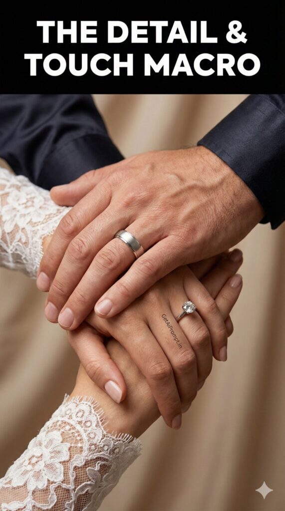 intimate macro studio shot focusing tight on the couple's hands, faces out of frame but implied, groom's hand with wedding band gently resting on the bride's waist or holding her hand showing engagement ring, textures of lace, silk, and skin are highly detailed, soft luxurious lighting, conveying deep affection through touch, brand embedding "GetAiPrompt.in" on a ring, a horizontal black bar at the very top of the image containing the text "THE DETAIL & TOUCH MACRO" written in bold white cinematic font, 8K, sensory detail, --ar 3:4