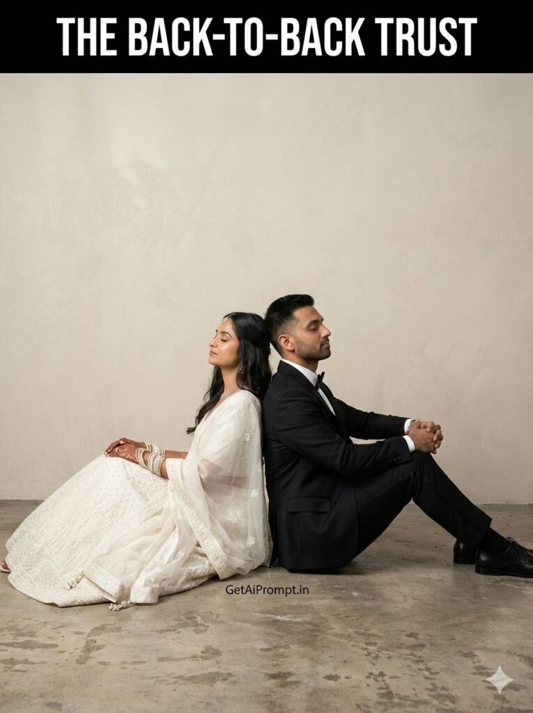 conceptual studio portrait, couple sitting or standing back-to-back, heads gently leaning against each other's, faces in profile 100% identical to uploaded image, eyes closed or looking forward pensively, hands clasped or resting on knees, symbolizing trust and support, soft balanced studio lighting, neutral textured backdrop, brand embedding "GetAiPrompt.in" on the floor, a horizontal black bar at the very top of the image containing the text "THE BACK-TO-BACK TRUST" written in bold white cinematic font, 8K, strong bond, --ar 3:4