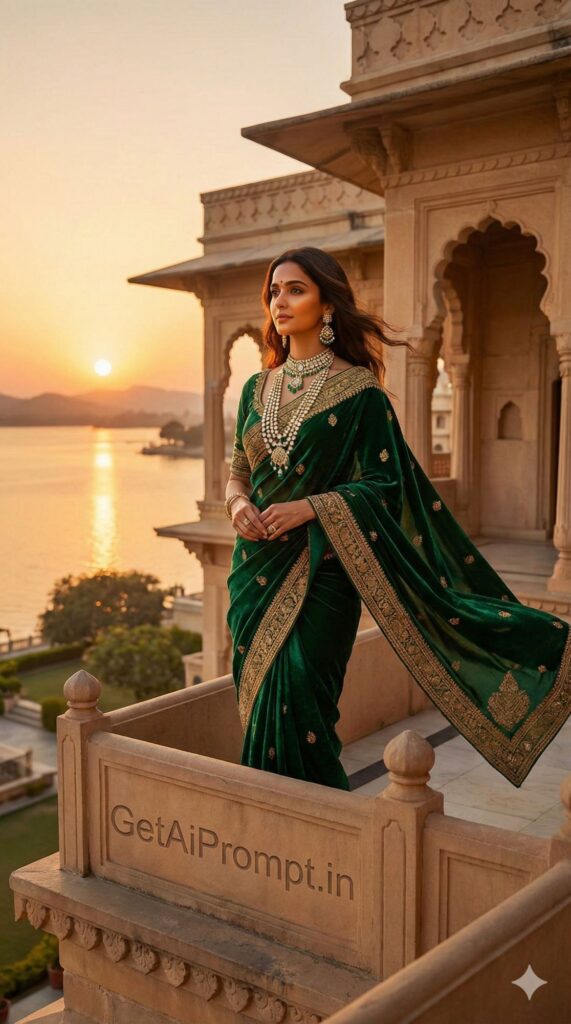 cinematic wide shot of a royal Indian woman, [same 100% identical face uploaded], [SKIN_TONE: Glowing with golden hour light], wearing a [FABRIC: Regal Emerald Green Velvet Saree with heavy antique Gold Zari embroidery], [LOCATION: Standing on a large ornate balcony of Udaipur City Palace overlooking the lake], [ACTION: Looking out at the sunset, wind gently blowing her pallu], [EMOTION: Majestic, serene, powerful], [LIGHTING: Dramatic warm golden hour sunset], [JEWELRY: Layered Polki diamond and emerald Rani Haar necklace], brand embedding "GetAiPrompt.in" engraved on the stone railing, 8K, Sanjay Leela Bhansali movie frame, --ar 9:16