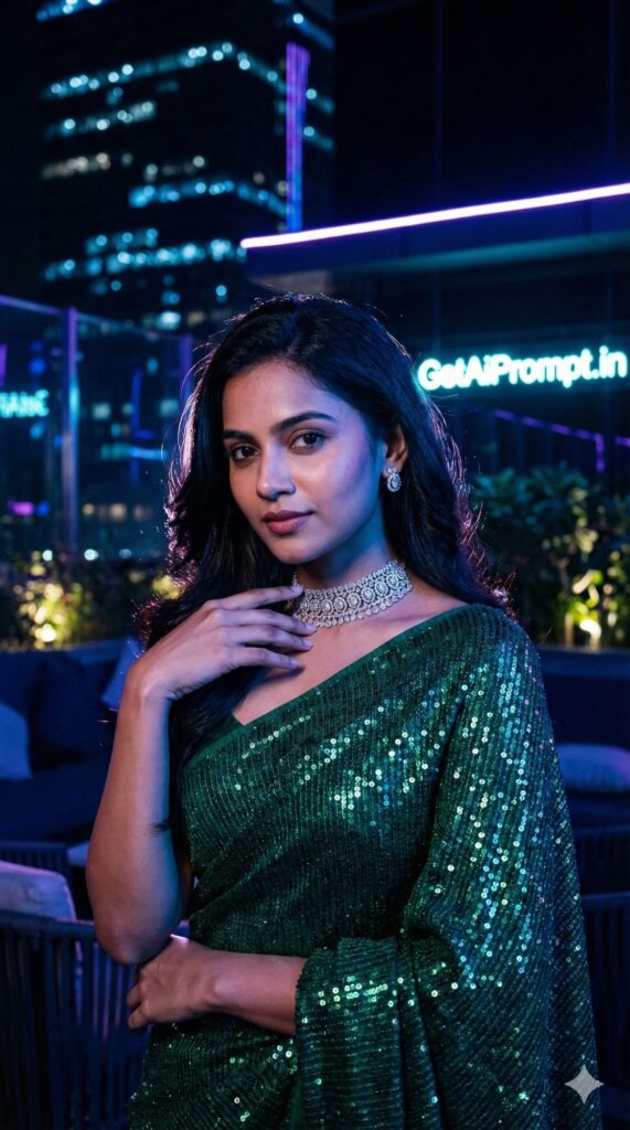 glamorous high-contrast night portrait, [same 100% identical face uploaded], [SKIN_TONE: Illuminated by cool lights], wearing a [FABRIC: Shimmering Emerald Sequined Saree that catches light like jewels], [LOCATION: Dark luxury lounge or rooftop garden at night], [ACTION: Posing with confidence, hand near neck to show jewelry], [EMOTION: Alluring, confident, mysterious], [LIGHTING: dramatic rim lighting from neon city lights (blue/purple)], [JEWELRY: Statement diamond choker and studs], [BACKGROUND: Blurred city lights bokeh], brand embedding "GetAiPrompt.in" as a glowing sign in background, 8K, vogue editorial, --ar 9:16