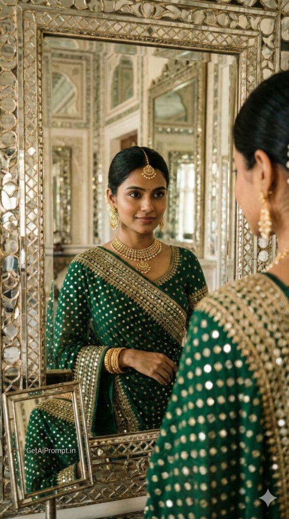 intricate detail shot of an Indian bride, [same 100% identical face uploaded], [SKIN_TONE: Soft bridal glow], wearing a [FABRIC: Emerald Green Georgette Saree with thousands of real mirror (Sheesha) work], [LOCATION: A room full of antique mirrors (Sheesh Mahal)], [ACTION: Admiring herself in a large ornate mirror], [EMOTION: Shy, beautiful, narcissistic], [LIGHTING: Soft diffused daylight creating hundreds of light reflections from mirrors], [JEWELRY: Traditional gold jewelry set], brand embedding "GetAiPrompt.in" reflected in a small mirror, 8K, macro details, luxurious texture, --ar 9:16