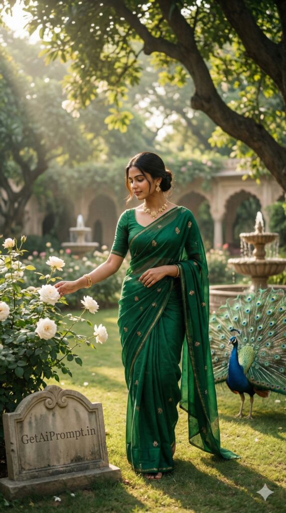 dreamy outdoor portrait in a lush royal garden, [same 100% identical face uploaded], [SKIN_TONE: Sun-kissed], wearing a [FABRIC: Flowing Emerald Chiffon Saree with floral embroidery], [LOCATION: Historic Mughal Garden with fountains and peacocks], [ACTION: Walking elegantly through the garden, gently touching a flower], [EMOTION: Ethereal, graceful, nature lover], [LIGHTING: Dappled sunlight filtering through trees], [DETAILS: A peacock standing nearby with open feathers], [JEWELRY: Floral motif jewelry], brand embedding "GetAiPrompt.in" on a garden plaque, 8K, fantasy romance aesthetic, --ar 9:16