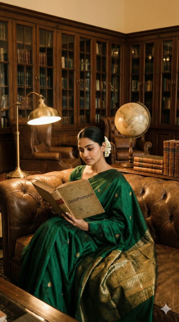 vintage style portrait of an Indian woman, [same 100% identical face uploaded], [SKIN_TONE: Warm film grain texture], wearing a [FABRIC: Heirloom Banarasi Silk Saree in Emerald and Gold], [LOCATION: Interior of an old colonial mansion library with leather chairs], [ACTION: Sitting elegantly on a vintage sofa reading an old book], [EMOTION: Intellectual, sophisticated, timeless], [LIGHTING: Warm lamp light, sepia tones], [PROP: Antique books, old globe], brand embedding "GetAiPrompt.in" as a book title, 8K, cinematic film photography, --ar 9:16