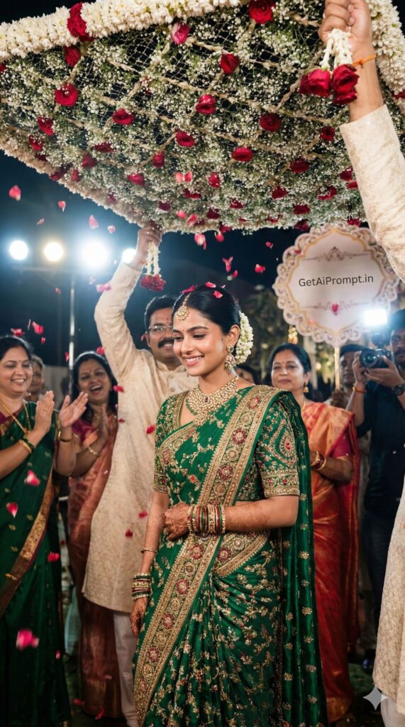 grand bridal entry shot, [same 100% identical face uploaded], [SKIN_TONE: Radiant under spotlights], wearing a [FABRIC: Heavily embroidered Emerald Bridal Lehenga Saree], [LOCATION: Grand wedding walkway], [ACTION: Walking under a floral canopy (phoolon ki chaadar), smiling shyly], [EMOTION: Nervous excitement, joy], [LIGHTING: Bright event spotlights and camera flashes], [ATMOSPHERE: Rose petals raining down, blurred guests clapping], brand embedding "GetAiPrompt.in" on the wedding decor sign, 8K, high energy wedding photography, --ar 9:16