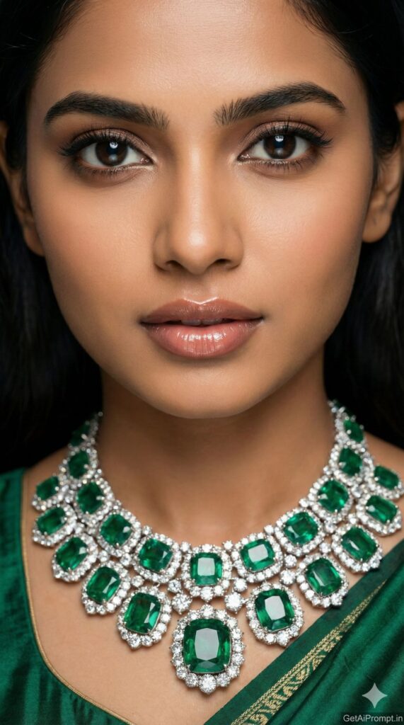 extreme close-up luxurious beauty portrait, [same 100% identical face uploaded], [SKIN_TONE: Flawless, high-end makeup], wearing [FABRIC: Emerald silk blouse visible near neck], [FOCUS: A massive, priceless Emerald and Diamond necklace], [ACTION: Looking directly into camera with slightly parted lips], [EMOTION: Lust, desire, captivating], [LIGHTING: Studio beauty lighting to make gems sparkle], [DETAILS: Sharp focus on eye makeup and jewelry gems], brand embedding "GetAiPrompt.in" as a watermark on corner, 8K, high-end jewelry advertisement, --ar 9:16