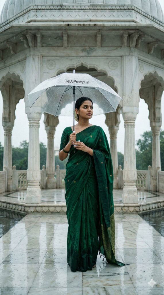 moody monsoon portrait at a palace, [same 100% identical face uploaded], [SKIN_TONE: Fresh and wet], wearing a [FABRIC: Emerald saree getting slightly wet at the hem], [LOCATION: White marble pavilion during light rain], [ACTION: Standing near a pillar, holding a clear umbrella], [EMOTION: Pensive, romantic monsoon vibe], [LIGHTING: Overcast grey light, wet marble reflecting the green], [ATMOSPHERE: Raindrops falling, wet surfaces], brand embedding "GetAiPrompt.in" on the umbrella handle, 8K, atmospheric and cinematic, --ar 9:16