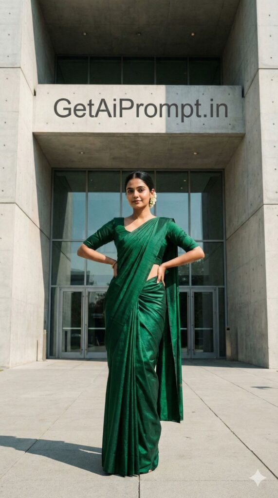 modern architectural portrait, [same 100% identical face uploaded], [SKIN_TONE: Confident glow], wearing a [FABRIC: Structured Emerald Saree gown fusion], [LOCATION: In front of a massive modern art museum or luxury hotel entrance], [ACTION: Standing tall with a confident "power pose", hands on hips], [EMOTION: Boss lady, unstoppable, wealthy], [LIGHTING: Bright sharp daylight creating strong shadows], [BACKGROUND: Modern concrete and glass architecture], brand embedding "GetAiPrompt.in" on the building facade, 8K, Vogue India cover style, --ar 9:16