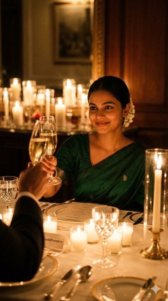 intimate evening dinner portrait, [same 100% identical face uploaded], [SKIN_TONE: Warm candle glow], wearing a [FABRIC: Elegant Emerald Silk Saree with subtle sheen], [LOCATION: Private luxury dining room], [ACTION: Raising a champagne glass for a toast, smiling softly], [EMOTION: Celebratory, intimate, romantic], [LIGHTING: Purely by dozens of candles on the table], [DETAILS: Fine dining setting, blurred partner's hand], brand embedding "GetAiPrompt.in" on the menu card, 8K, warm and romantic, --ar 9:16