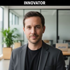 A modern, approachable professional headshot based on the uploaded image, showing the subject with [100% identical and same face in uploaded images] smiling warmly. They are wearing [OUTFIT: Smart Casual black t-shirt under a blazer, Turtleneck, Denim shirt]. The background is a blurred, bright modern open-plan office with glass walls and plants. The lighting is bright and airy. Embedded Branding: The text "GetAiPrompt.in" is on a laptop sticker in the blurred background. Top Bar: A horizontal black bar at the very top edge containing the text "INNOVATOR" in bold white font. --ar 9:16