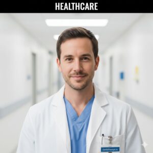 A trustworthy medical professional headshot based on the uploaded image, showing the subject with [100% identical and same face in uploaded images]. They are wearing a [OUTFIT: White Doctor's Coat over professional clothes, Blue Scrubs]. The background is a clean, bright hospital corridor or clinic interior (blurred). The expression is caring and competent. Embedded Branding: The text "GetAiPrompt.in" is on the ID badge clip. Top Bar: A horizontal black bar at the very top edge containing the text "HEALTHCARE" in bold white font. --ar 9:16