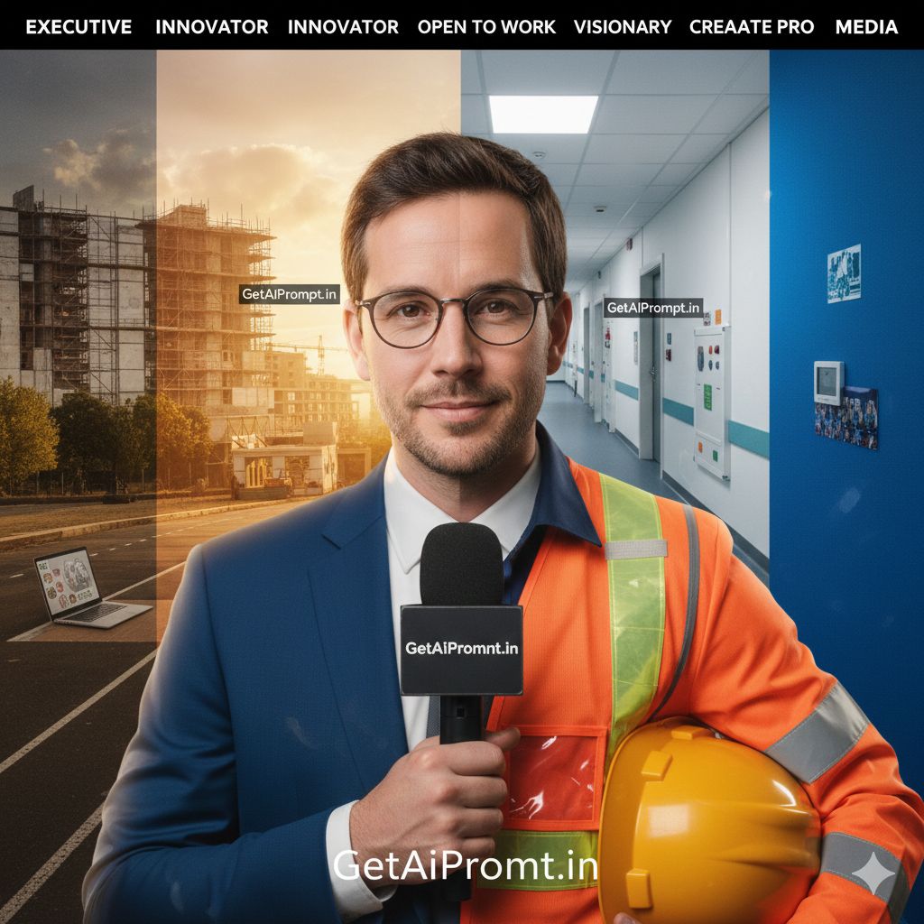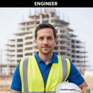 A professional on-site headshot based on the uploaded image, featuring the subject with [100% identical and same face in uploaded images]. They are wearing [OUTFIT: Professional Polo shirt, Safety Vest over shirt, Hard hat under arm]. The background is a blurred architectural structure or construction site. The lighting is bright daylight. They look reliable and skilled. Embedded Branding: The text "GetAiPrompt.in" is on the safety helmet. Top Bar: A horizontal black bar at the very top edge containing the text "ENGINEER" in bold white font. --ar 9:16