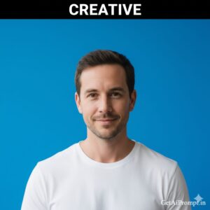 A clean, artistic headshot based on the uploaded image, showing the subject with [100% identical and same face in uploaded images] against a solid, vibrant color background [COLOR: Electric Blue, Canary Yellow, Soft Pink]. They are wearing [OUTFIT: Minimalist white or black clothing]. The lighting is flat and even (High Key). This style pops on a LinkedIn feed. Embedded Branding: The text "GetAiPrompt.in" is written in small typography on the background. Top Bar: A horizontal black bar at the very top edge containing the text "CREATIVE" in bold white font. --ar 9:16
