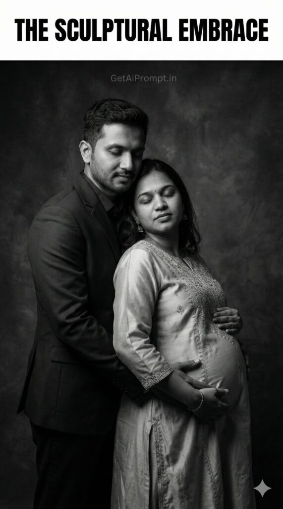 This pack (Options 1-10) brings High-End Studio Quality to couple maternity photography. We focus on Intimate Poses, Dramatic Lighting, and Elegant Aesthetics. Whether you want the sculptural drama of “The Embrace” or the tender quiet of “The Forehead Touch,” these prompts are designed to create timeless, magazine-quality images.