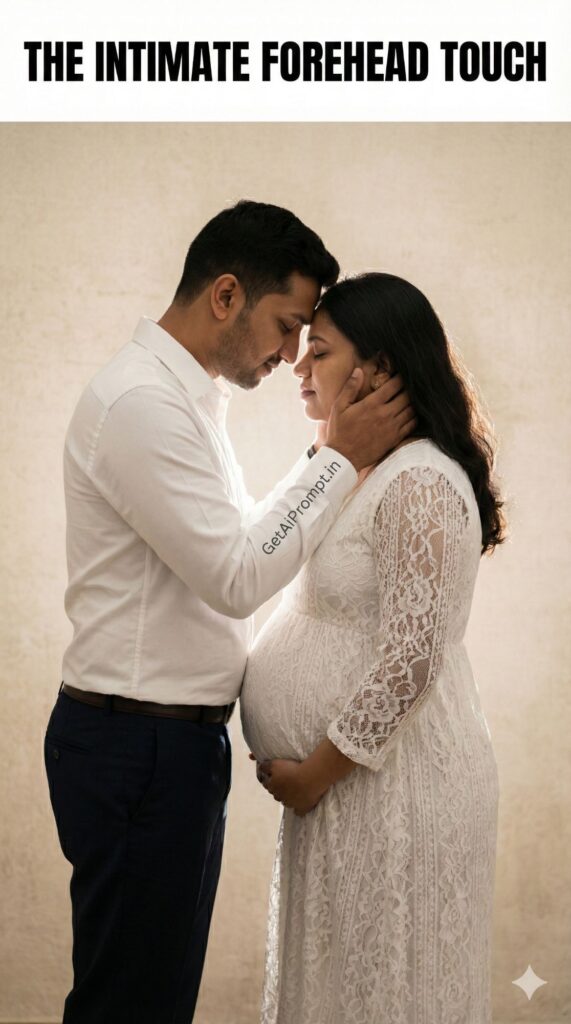 tender and intimate studio portrait in profile, couple standing facing each other with foreheads gently touching, eyes closed, faces 100% identical to uploaded image, partner's hands cupping woman's face/neck, woman's hands on her bump, woman wearing a [MOTHER_OUTFIT: Lace Dress], partner in a [PARTNER_OUTFIT: Crisp White Shirt & Trousers], soft warm [LIGHTING_STYLE: Backlight] (rim light) creating a halo effect around them against a light beige [BACKDROP: Textured wall], feeling of deep peace and affection, brand embedding "GetAiPrompt.in" on the partner's cuff, a horizontal black bar at the very top of the image containing the text "THE INTIMATE FOREHEAD TOUCH" written in bold white cinematic font, 8K, emotional depth, --ar 9:16