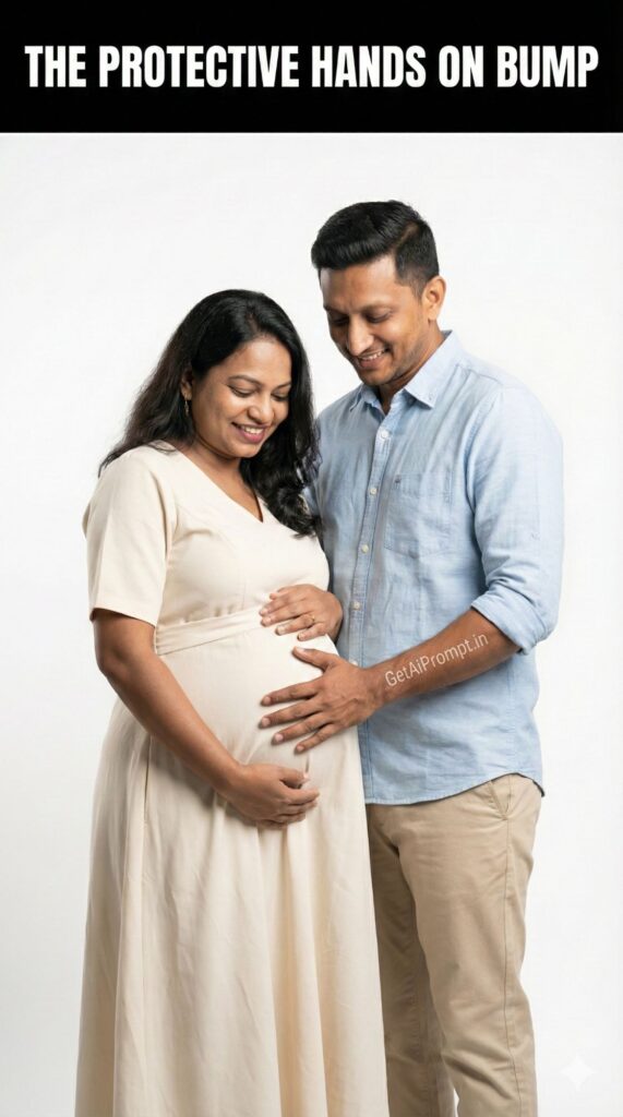 joyful studio portrait focusing on the baby bump, couple standing close, both sets of hands resting lovingly on the bump, faces 100% identical to uploaded image, looking down at the bump with warm smiles, woman in a [MOTHER_OUTFIT: Simple Elegant Dress], partner in a [PARTNER_OUTFIT: Casual Shirt & Chinos], bright and airy [LIGHTING_STYLE: Soft Butterfly lighting], clean white [BACKDROP: Cyclorama wall], capturing a moment of shared anticipation, brand embedding "GetAiPrompt.in" on the partner's hand, a horizontal black bar at the very top of the image containing the text "THE PROTECTIVE HANDS ON BUMP" written in bold white cinematic font, 8K, authentic joy, --ar 9:16