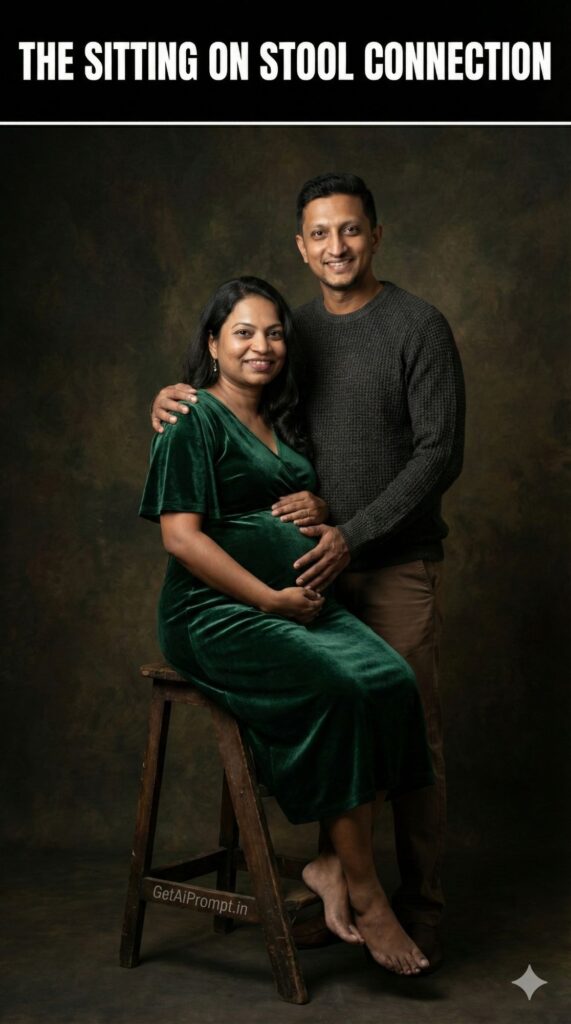classic studio pose, pregnant woman sitting gracefully on a vintage wooden stool, partner standing closely beside or behind her with a hand on her shoulder or bump, faces 100% identical to uploaded image, both looking at the camera with relaxed, loving smiles, woman in a [MOTHER_OUTFIT: Midi Dress], partner in a [PARTNER_OUTFIT: Sweater & Slacks], soft portrait [LIGHTING_STYLE: Directional lighting], dark textured [BACKDROP: Old master style], feeling of comfort and closeness, brand embedding "GetAiPrompt.in" on the stool leg, a horizontal black bar at the very top of the image containing the text "THE SITTING ON STOOL CONNECTION" written in bold white cinematic font, 8K, timeless portrait, --ar 9:16
