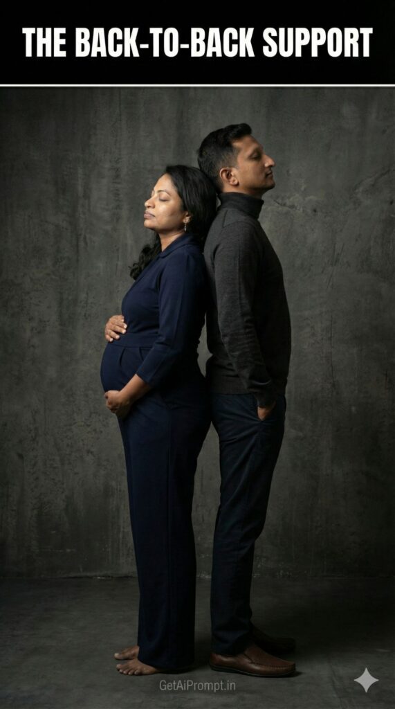 conceptual studio shot, couple standing back-to-back, heads gently leaning against each other's, faces in profile 100% identical to uploaded image, eyes closed or looking forward pensively, woman's hands on her bump, partner's arms crossed or hands in pockets, woman in a [MOTHER_OUTFIT: Elegant Jumpsuit], partner in a [PARTNER_OUTFIT: Dark Turtleneck & Trousers], dramatic [LIGHTING_STYLE: Side lighting] emphasizing their profiles, dark concrete [BACKDROP: Textured wall], symbolizing trust and support, brand embedding "GetAiPrompt.in" on the floor, a horizontal black bar at the very top of the image containing the text "THE BACK-TO-BACK SUPPORT" written in bold white cinematic font, 8K, strong bond, --ar 9:16