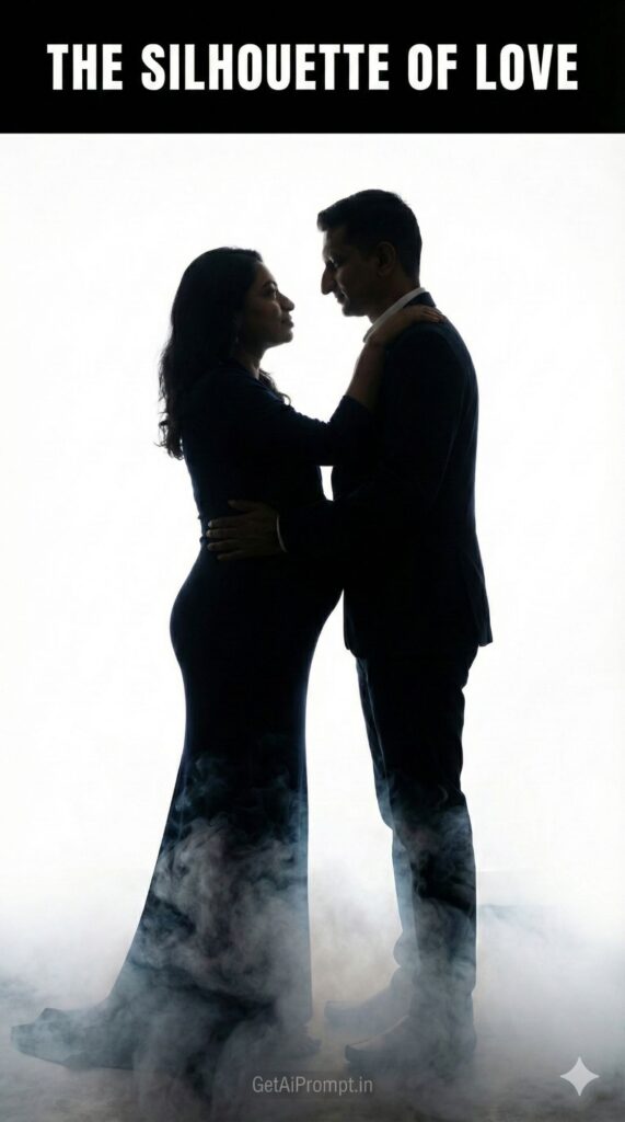 dramatic silhouette studio shot, couple standing in profile facing each other, holding hands or embracing, outlines of their faces, bodies, and the baby bump 100% identical to uploaded image (shape match), backlit by a strong light source creating a rim around them against a bright [BACKDROP], woman in a [MOTHER_OUTFIT: Form-fitting Dress], partner in a [PARTNER_OUTFIT: Suit], theatrical fog or smoke swirling around their feet creating atmosphere, brand embedding "GetAiPrompt.in" in the smoke, a horizontal black bar at the very top of the image containing the text "THE SILHOUETTE OF LOVE" written in bold white cinematic font, 8K, moody and artistic, --ar 9:16
