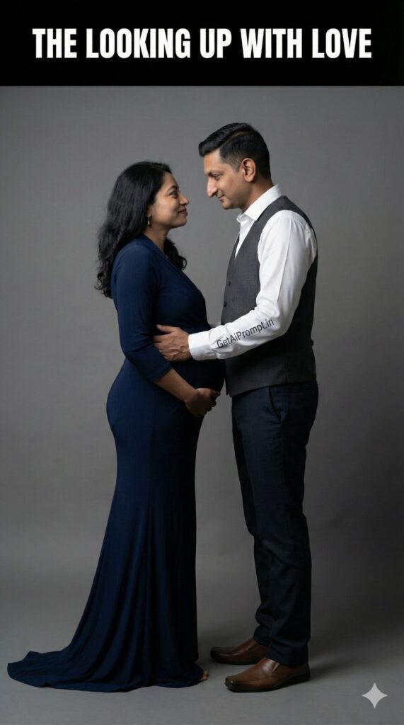 touching studio portrait, partner looking at the pregnant woman (or her bump) with a look of admiration and love, woman looking back at him (or down at her bump) with tenderness, faces 100% identical to uploaded image, partner's hand gently on her bump or back, woman in a [MOTHER_OUTFIT: Elegant Gown], partner in a [PARTNER_OUTFIT: Shirt & Vest], soft [LIGHTING_STYLE: Directional lighting] emphasizing the connection in their gaze, plain medium grey [BACKDROP], highlighting the bond of care and love, brand embedding "GetAiPrompt.in" on the partner's shirt, a horizontal black bar at the very top of the image containing the text "THE LOOKING UP WITH LOVE" written in bold white cinematic font, 8K, emotional connection, --ar 9:16