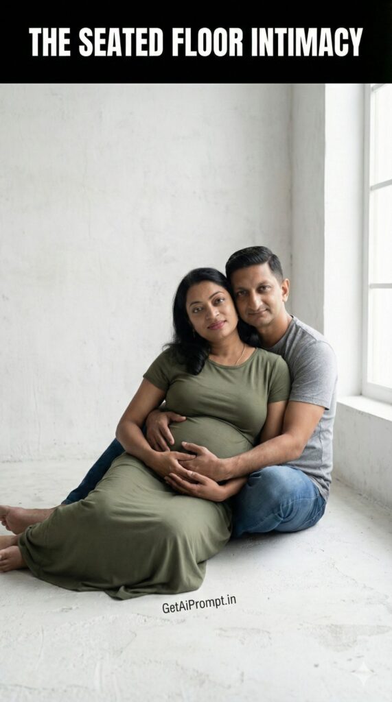 raw and grounded studio portrait, couple sitting closely together on the floor against a textured [BACKDROP: Concrete wall], woman sitting between partner's legs, his arms wrapped around her and the bump, leaning heads together, faces 100% identical to uploaded image, looking at the camera with relaxed, intimate expressions, woman in a [MOTHER_OUTFIT: Casual Maxi Dress], partner in a [PARTNER_OUTFIT: T-shirt & Jeans], soft natural-style light from a large window (simulated), brand embedding "GetAiPrompt.in" on the floor, a horizontal black bar at the very top of the image containing the text "THE SEATED FLOOR INTIMACY" written in bold white cinematic font, 8K, authentic connection, --ar 9:16